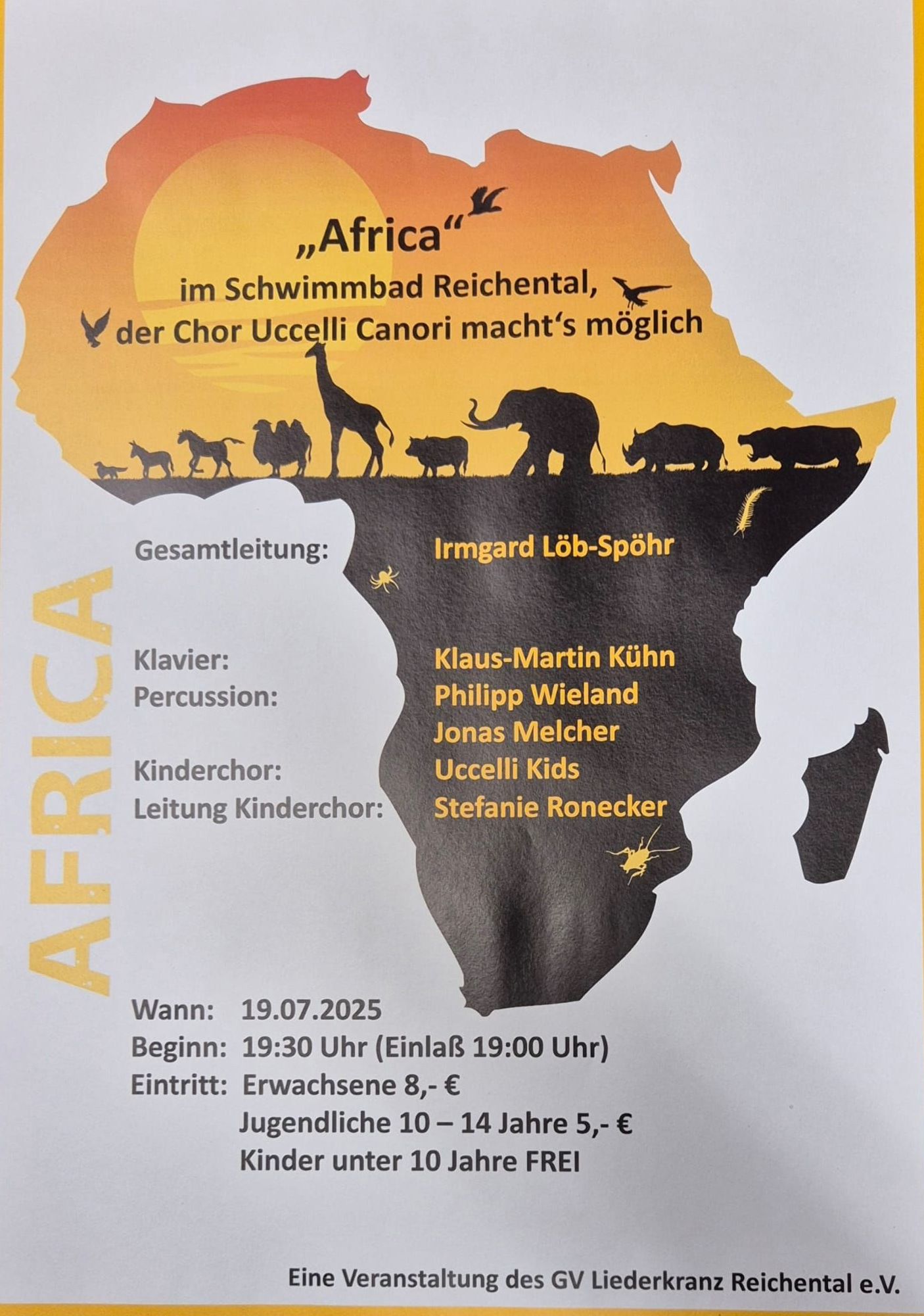 Nach dem großen Erfolg im Jahr 2023 in der Stadthalle in Gernsbach präsentiert der Chor Uccelli Canori noch einmal sein Programm „Afrika“. Diesmal im wunderschönen Schwimmbad in Reichental am Samstag, 19. Juli. Unter der Leitung von Irmgard Löb-Spöhr singt der Chor Lieder aus und über Afrika unter freiem Himmel. Begleitet werden die Sängerinnen und Sänger von Klaus-Martin Kühn am Klavier sowie Philpp Wieland und Jonas Melcher an den Percussions. Auch der Kinderchor „Uccelli Kids“ unter der Leitung von Stefanie Ronecker wird wieder mit dabei sein.